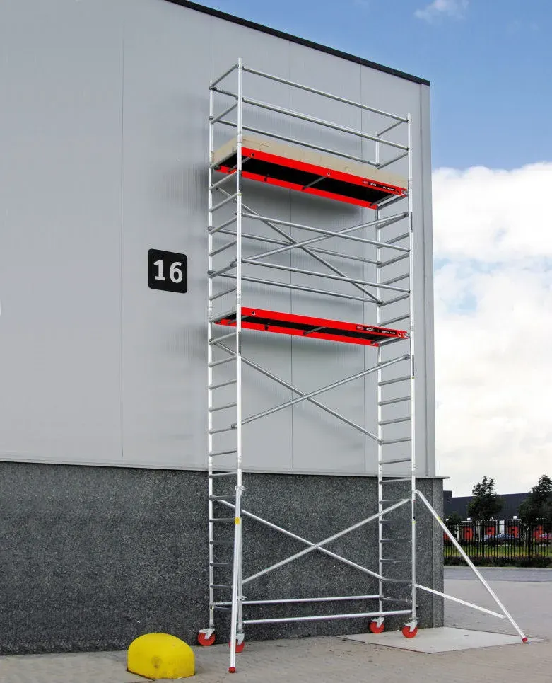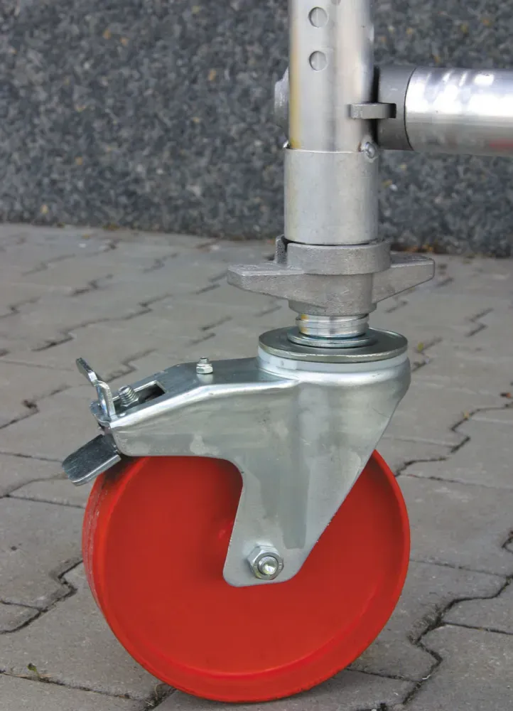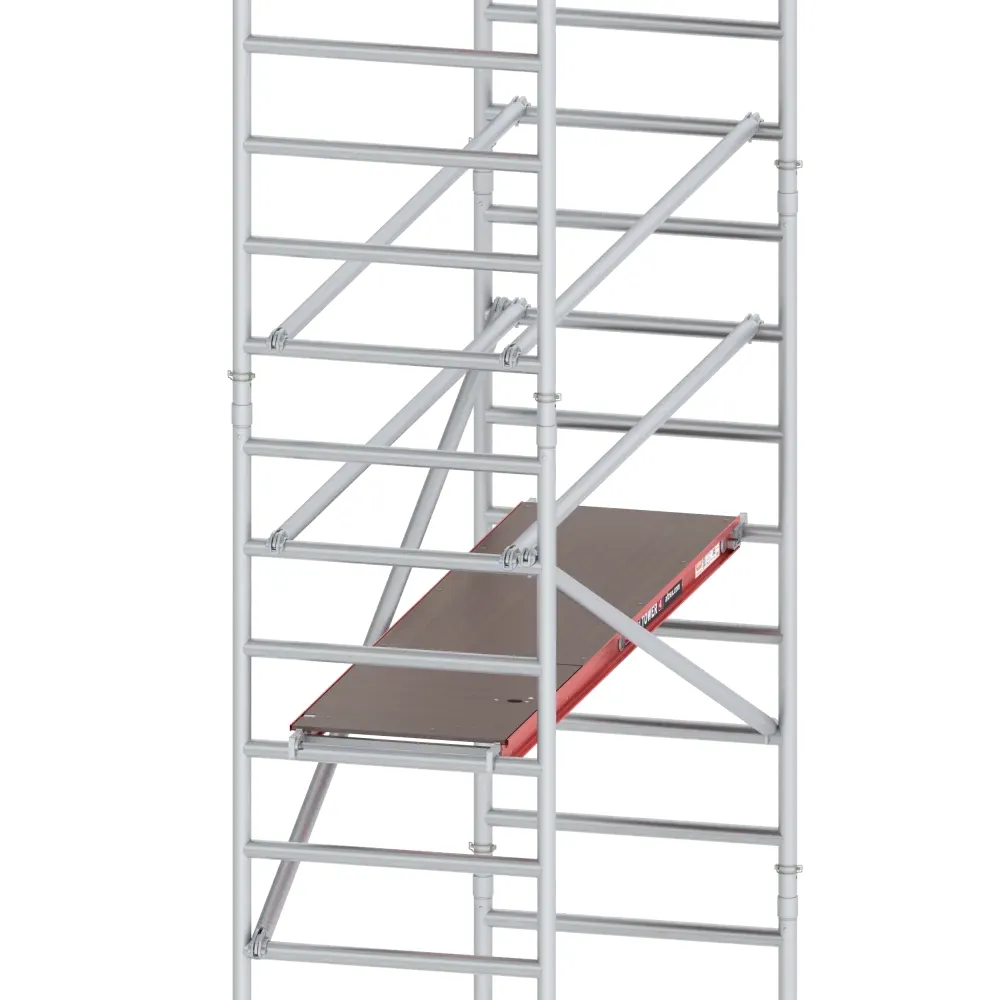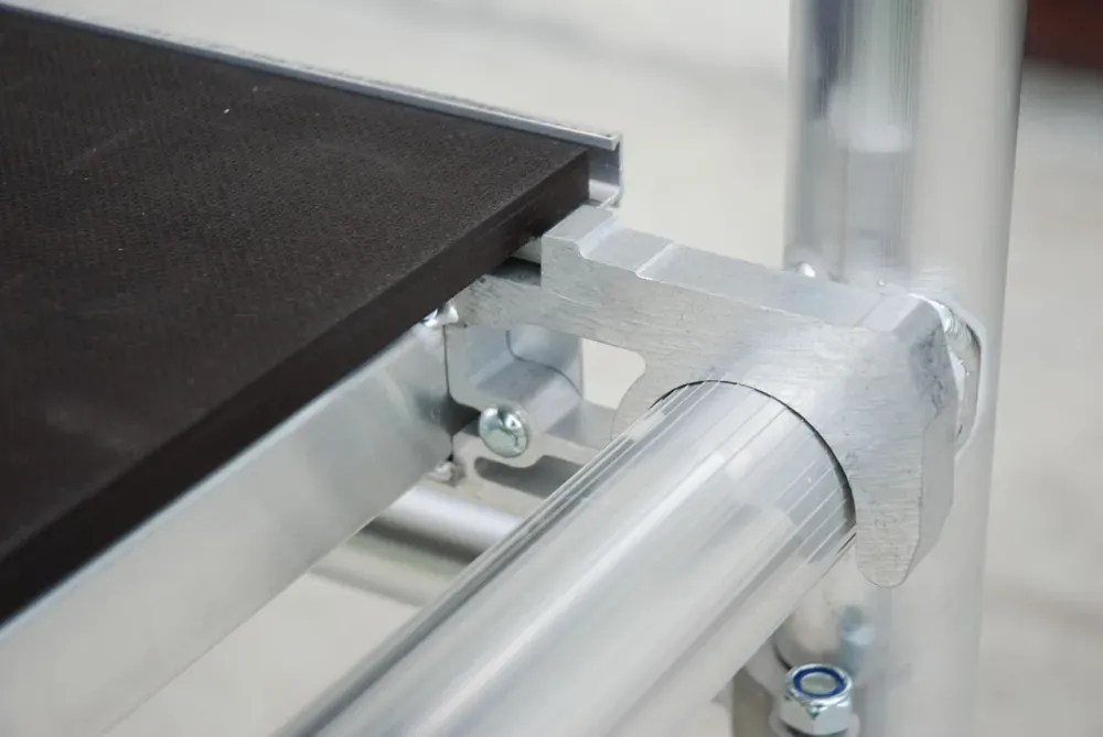 Altrex 4100 PLUS umożliwia płynną regulację, co szczebel bez przepinania stężeń. Rusztowania posiadają antypoślizgowe, profilowane szczeble. Średnica zastosowanych rur to 50 mm.
