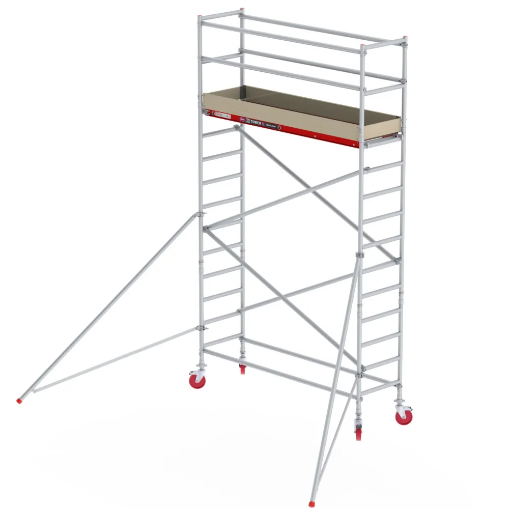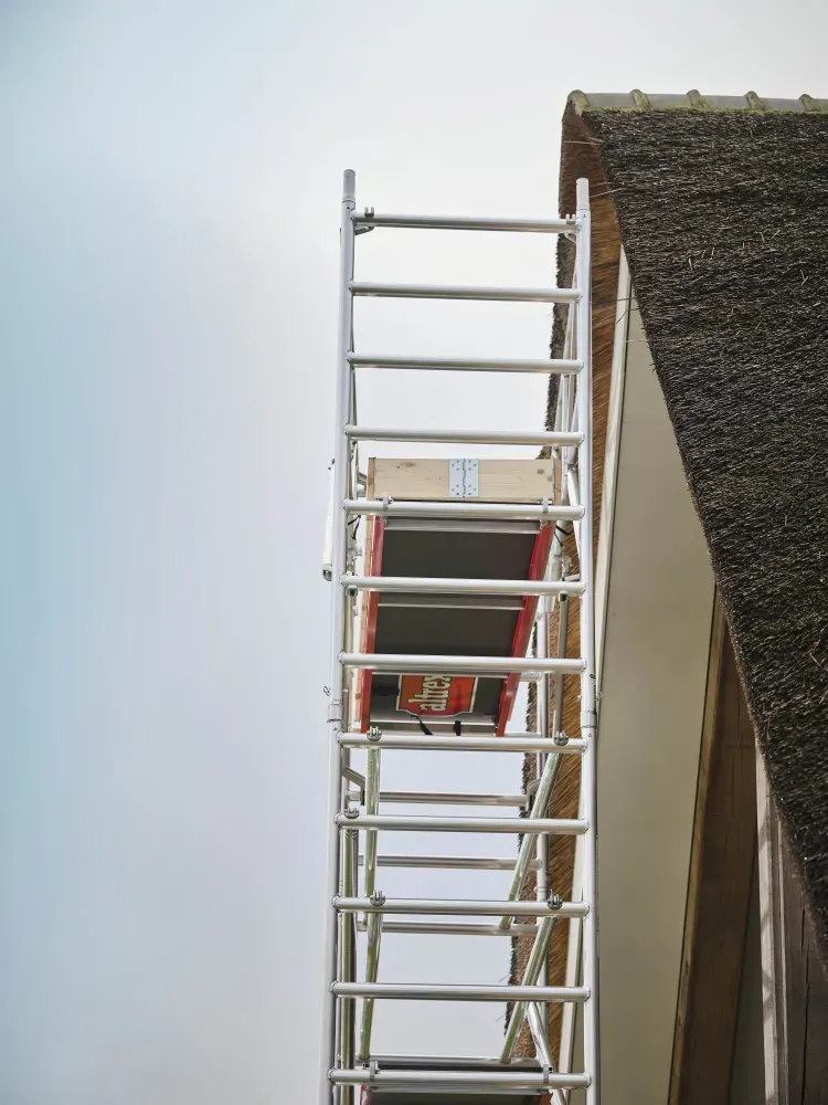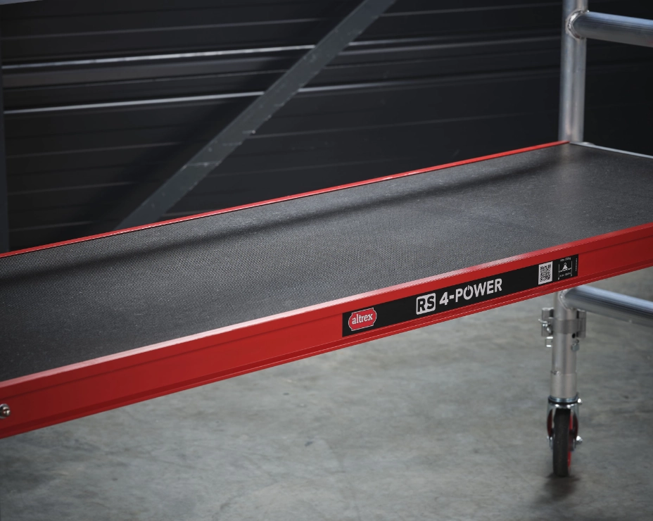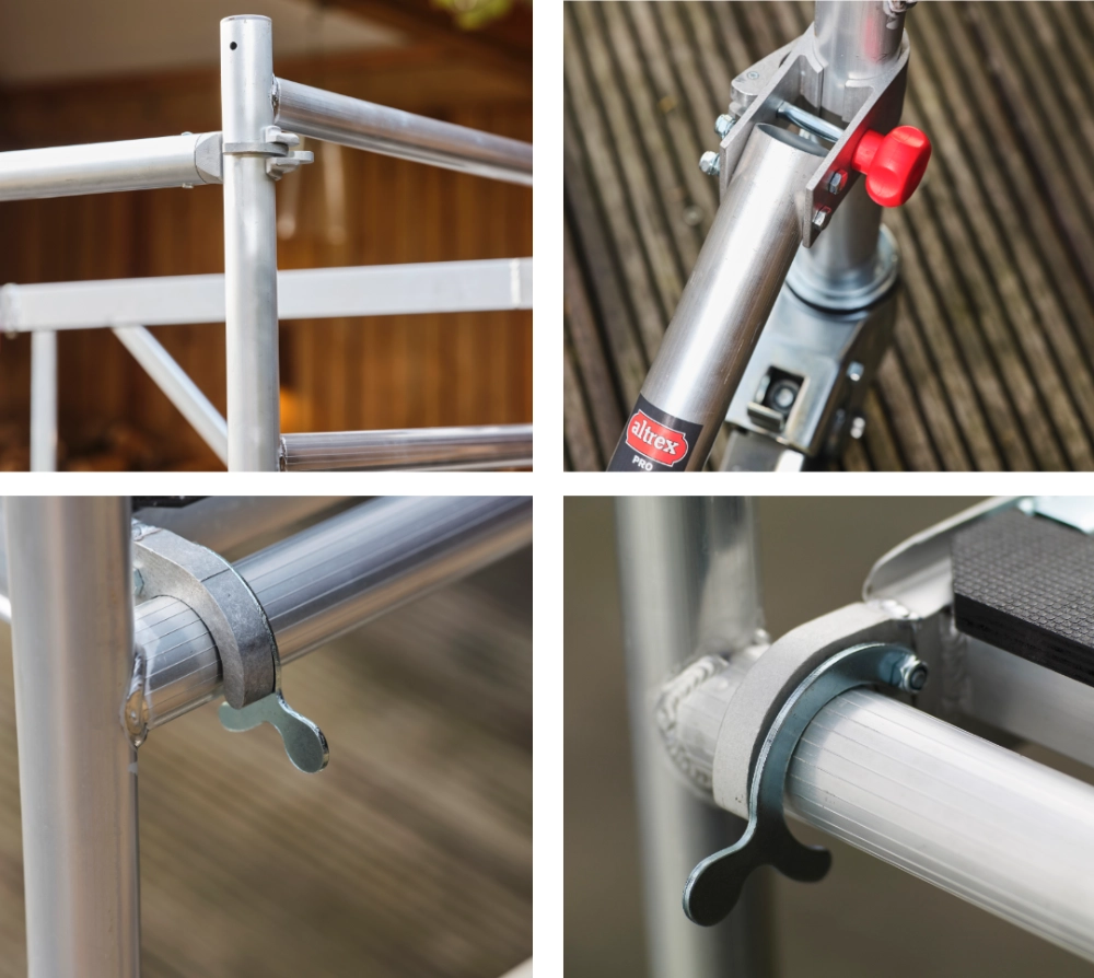 Altrex 4100 PLUS umożliwia płynną regulację, co szczebel bez przepinania stężeń. Rusztowania posiadają antypoślizgowe, profilowane szczeble. Średnica zastosowanych rur to 50 mm.